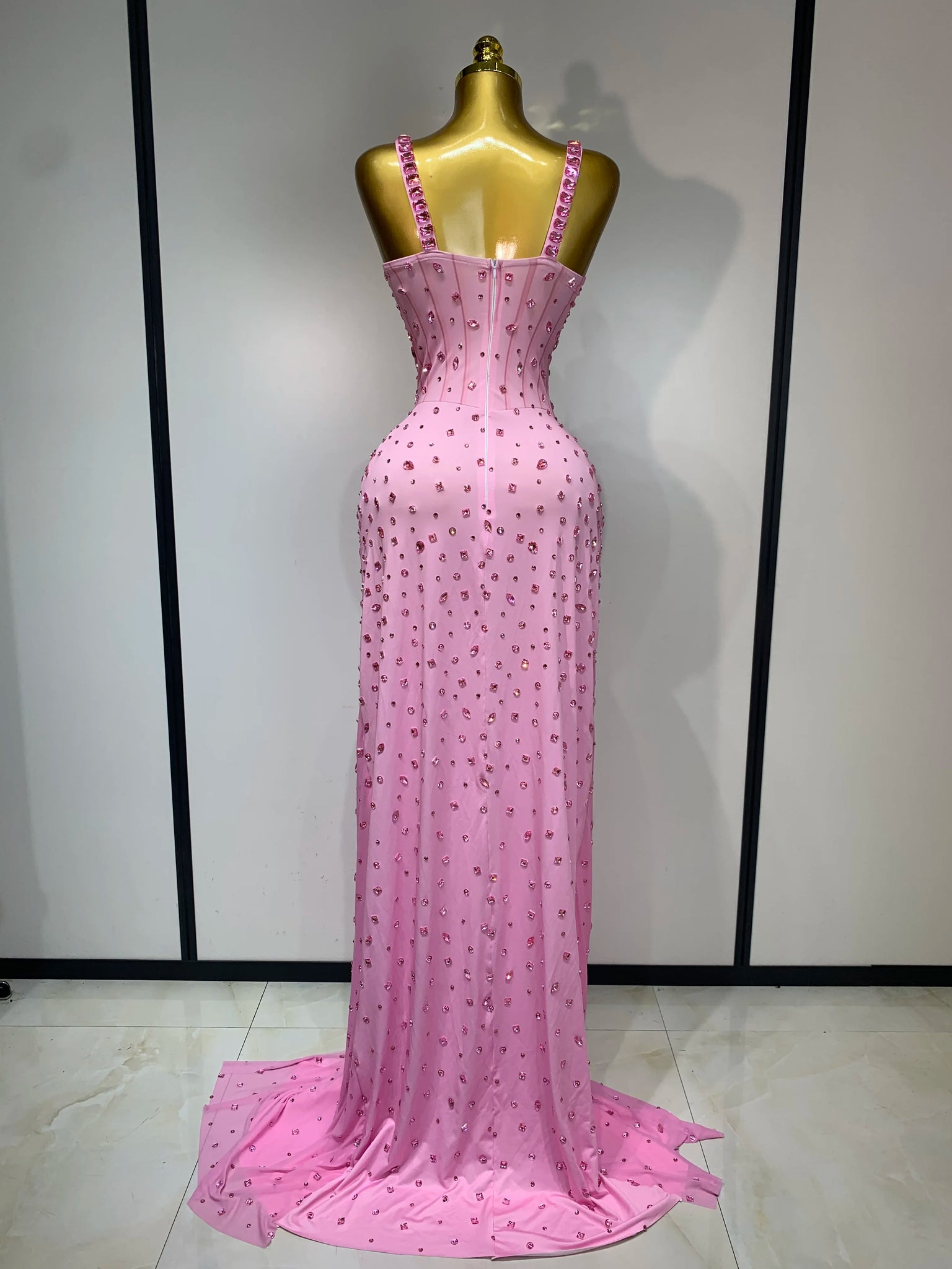 • Barbie-pink corset gown with all-over embellishments