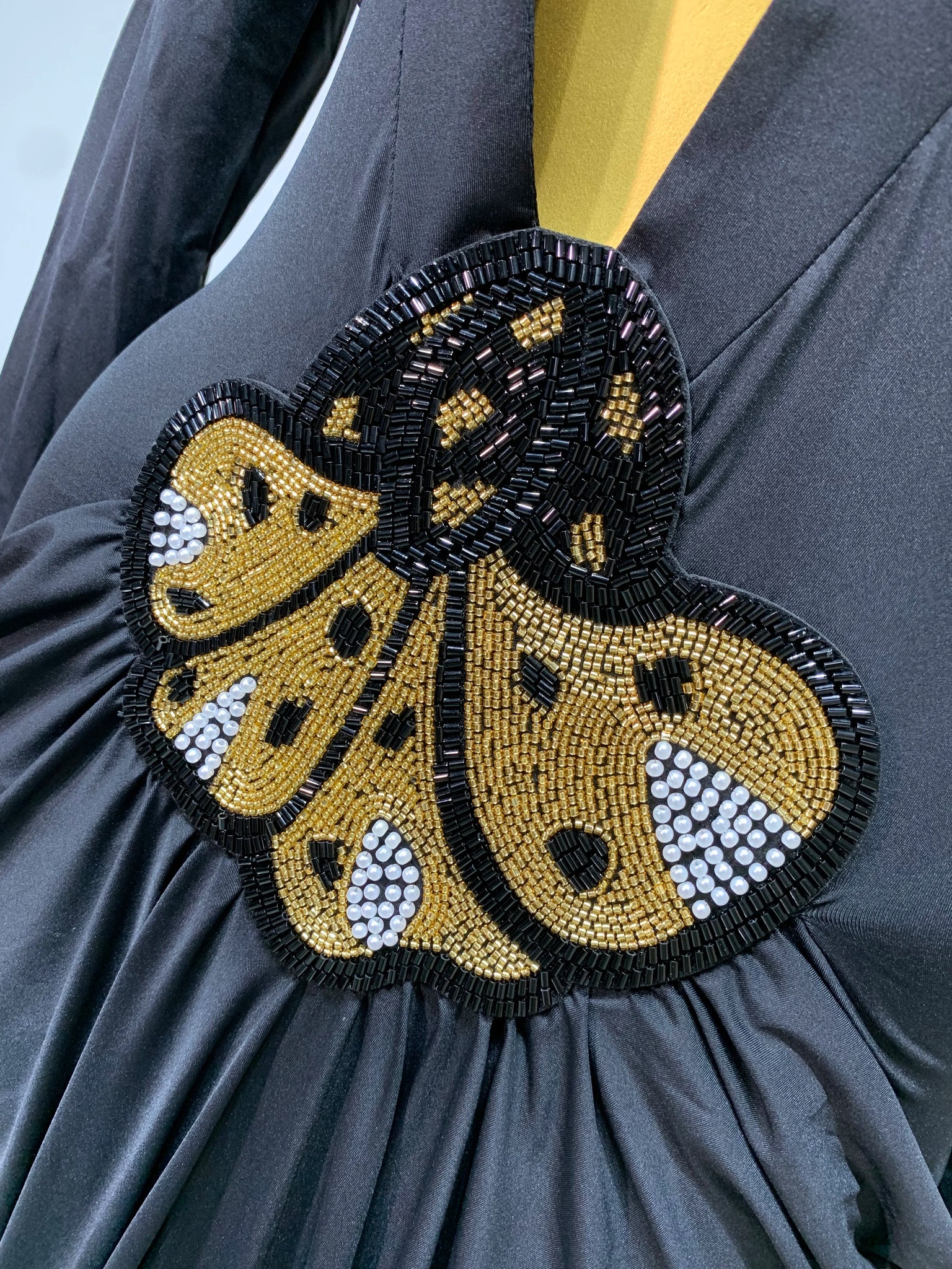 Statement Butterfly Embellishment – A luxe sequin-detailed butterfly adorns the waist, adding a bold artistic centerpiece.