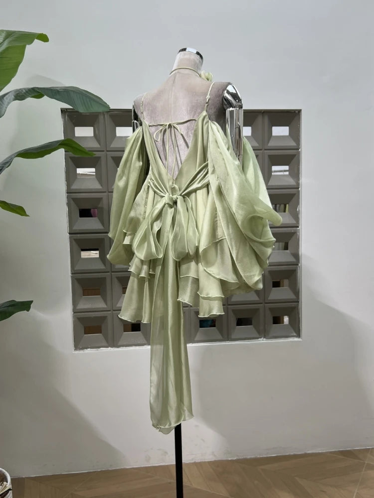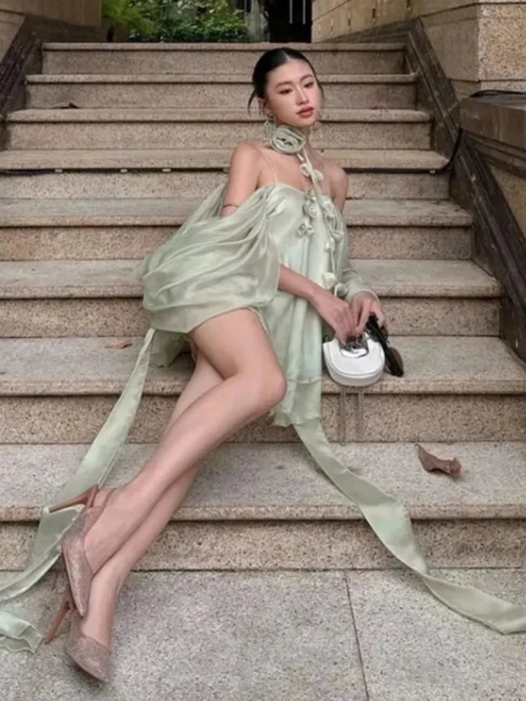 Float into elegance with this ethereal pastel green chiffon mini dress — a dreamy blend of soft femininity and modern romance. Crafted with luxurious layered chiffon, this off-shoulder dress features delicate ruffles, a flared silhouette, and an oversized rosette tie around the neck that cascades into a whimsical ribbon detail. The sheer fabric offers a breezy, light-as-air look perfect for garden parties, bridal showers, beach holidays, or romantic date nights.